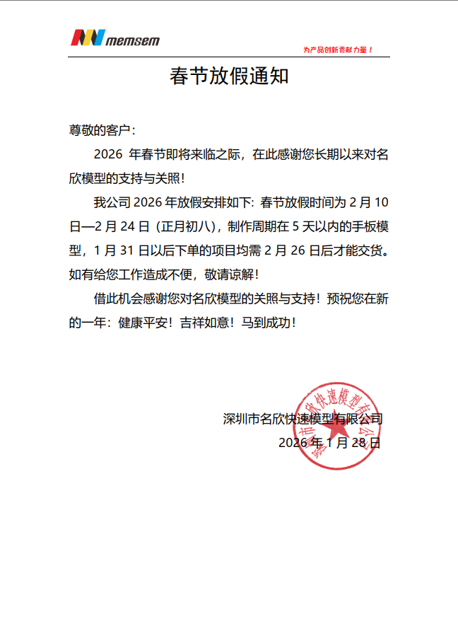 我公司2026年放假安排如下: 春节放假时间为2月10日—2月24日(正月初八),制作周期在5个工作日内的手板1月31日以后下单的项目均需2月26日后才能交货,如需赶在春节前的项目请提前下单。